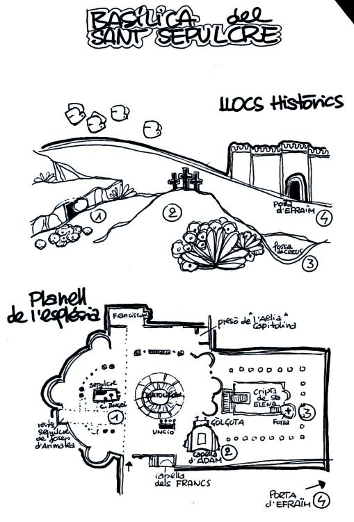 L'esboç de baix és la simplificació d'un planell de la basílica actual del St. Sepulcre. Les numeracions dels dos dibuixos es corresponen.